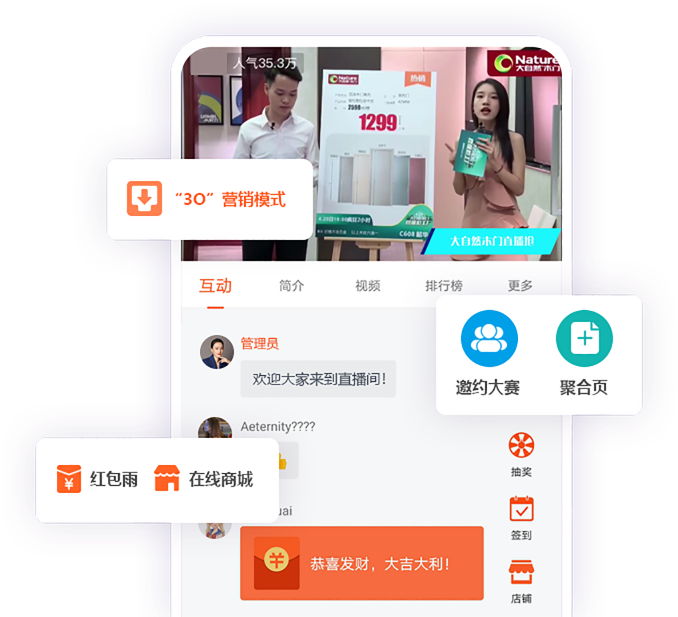 抽奖、红包雨、秒杀、在线商城等100+直播功能促进流量高效转化!
