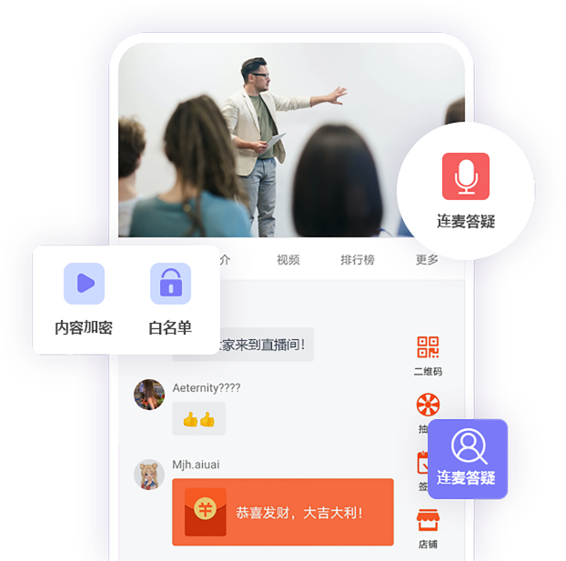获取方案讲师与观众音视频连麦答疑互动,专业问答内容库,错过弹幕也不怕!