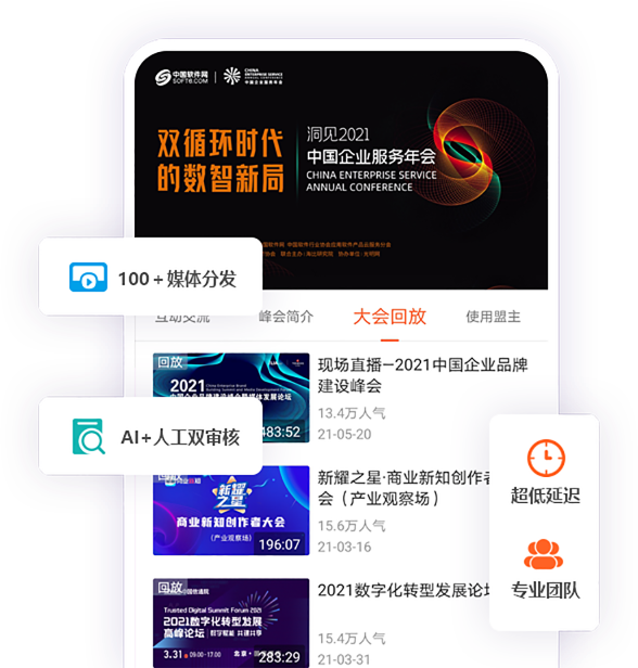 获取方案100+媒体同步分发,最大化直播曝光,提供千万级流量支持。